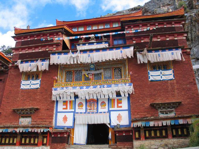 在后山的岩壁上,有很多古老的岩画和修行的山洞,其中有一 幅岩画和文字是噶玛巴·都松钦巴亲手所写。所写内容是:一是他说在藏区留下最多的东西在这里。二是他的预言:下面是他第二世到第八世的情况。