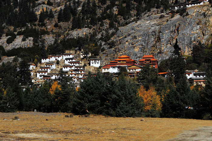 寺院依山俯视水风景如画。寺内存有一世噶玛巴•都松钦巴自塑雕像一尊,为罕见文物。大师生前留下的手迹。鼻血岩画令人肃然起敬。在秀丽的桑堆河中,游鱼成群。该寺僧人常用手抚摸鱼背,喂以糌。